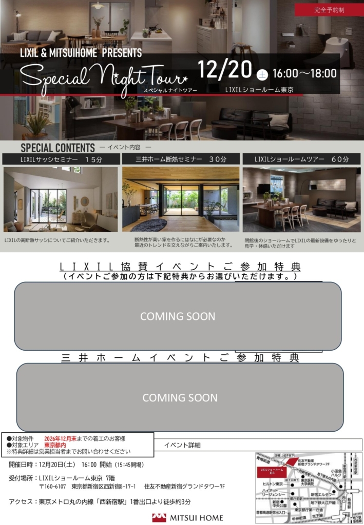 夜の落ち着いた時間帯に、住宅づくりに役立つ知識と、上質な空間をじっくりご体感ください。
