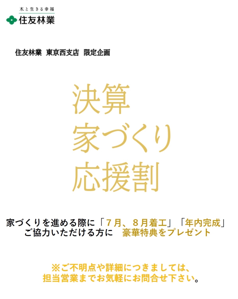 2025.12.11 住友林業 東京西支店 限定企画 「決算 家づくり応援割」 住友林業 東京西支店 限定企画 決算 家づくり応援割 家づくりをお考えの方へ、期間限定の特別企画をご用意いたしました。 「7月、8月着工」→「年内完成」にご協力頂けるお客様に、 決算だけの限定特典をプレゼントいたします。 理想の住まいを、来年中にかたちにする絶好の機会です。 スケジュールや資金計画も、担当スタッフがしっかりサポートいたします。 まずは、お気軽にご相談ください。 < 一覧へ戻る